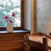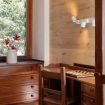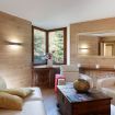 - Zona smart working e wi fi illimitato on una lunga scrivania in legno, un pezzo vintage di fine anni '70, posizionata di fronte all'ampia vetrata che si affaccia sul panorama delle piste da sci.