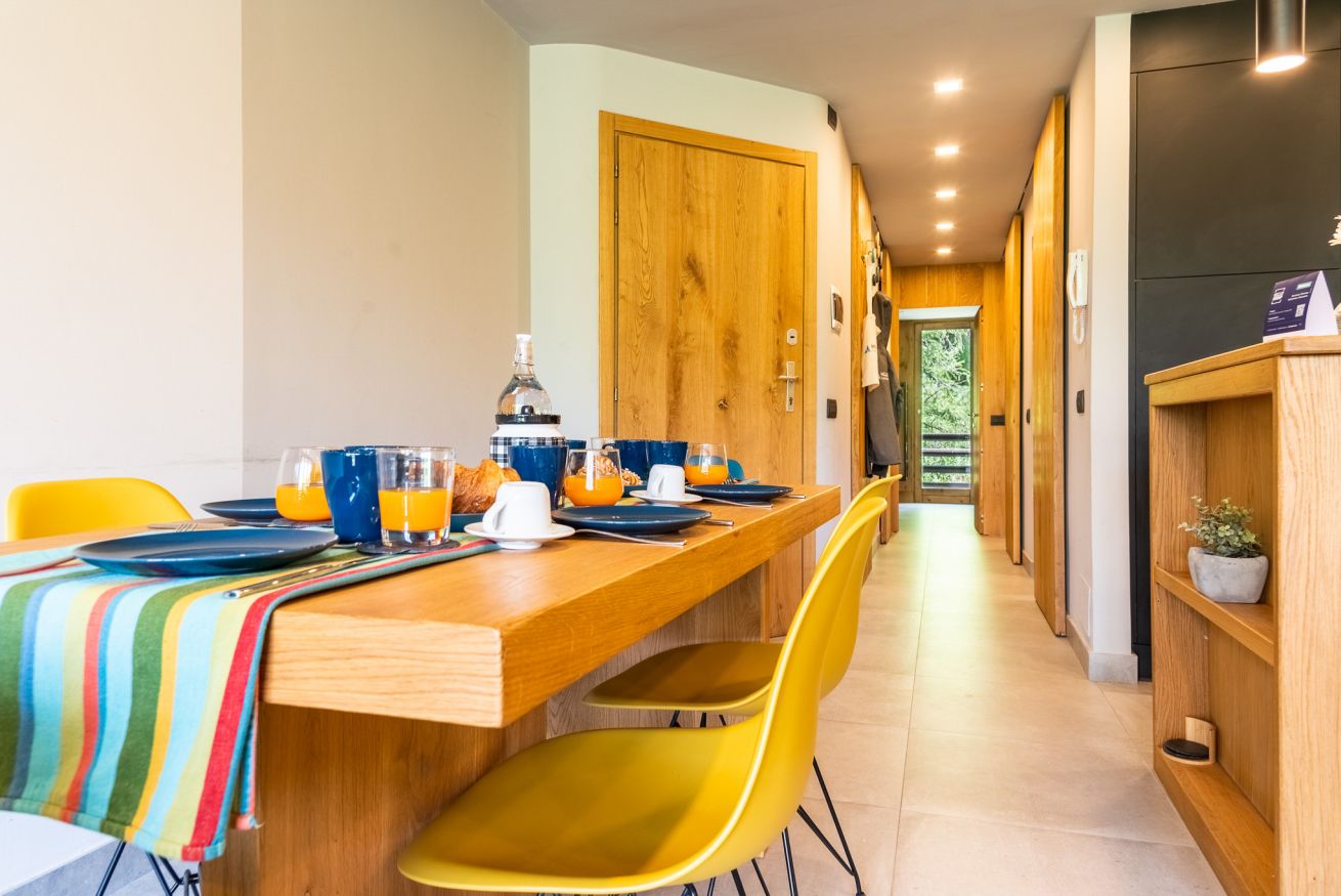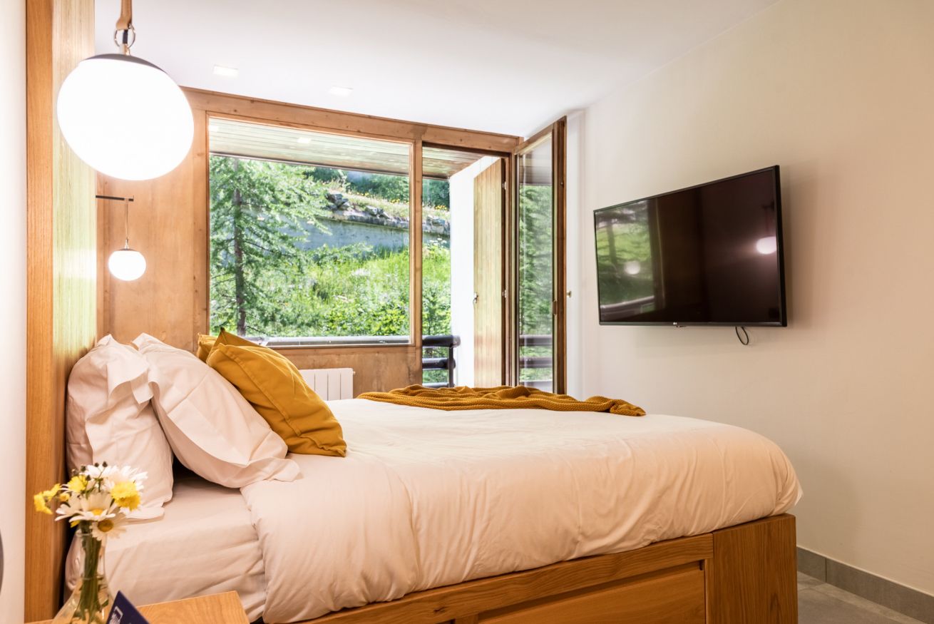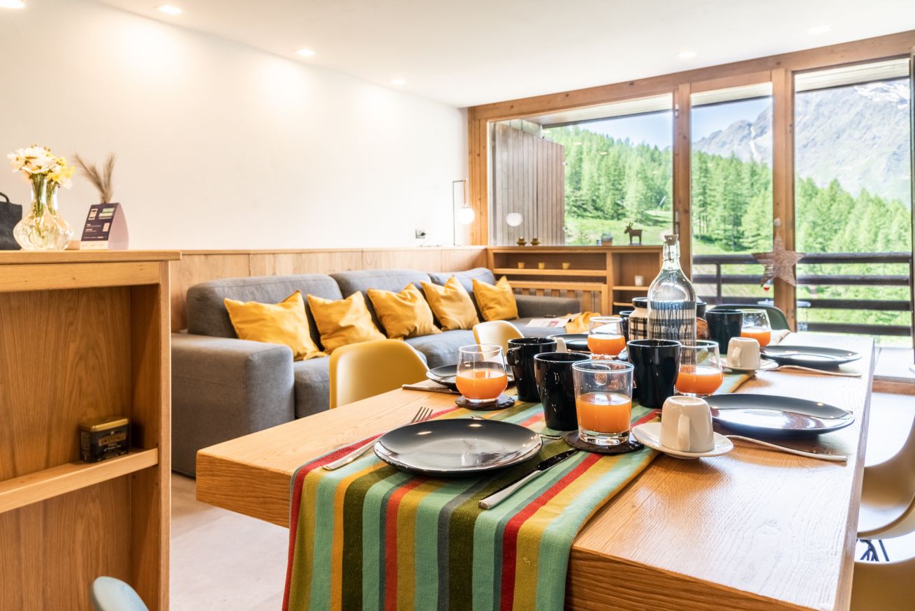 La recente ristrutturazione ha ridisegnato gli spazi in chiave contemporanea, lasciando protagoniste le ampie vetrate e le viste mozzafiato sulle montagne. Che sia inverno o estate, i balconi attrezzati offrono luce naturale e scorci emozionanti, di cui godere per una colazione al sole oppure un brindisi al tramonto dopo una giornata sulla neve.