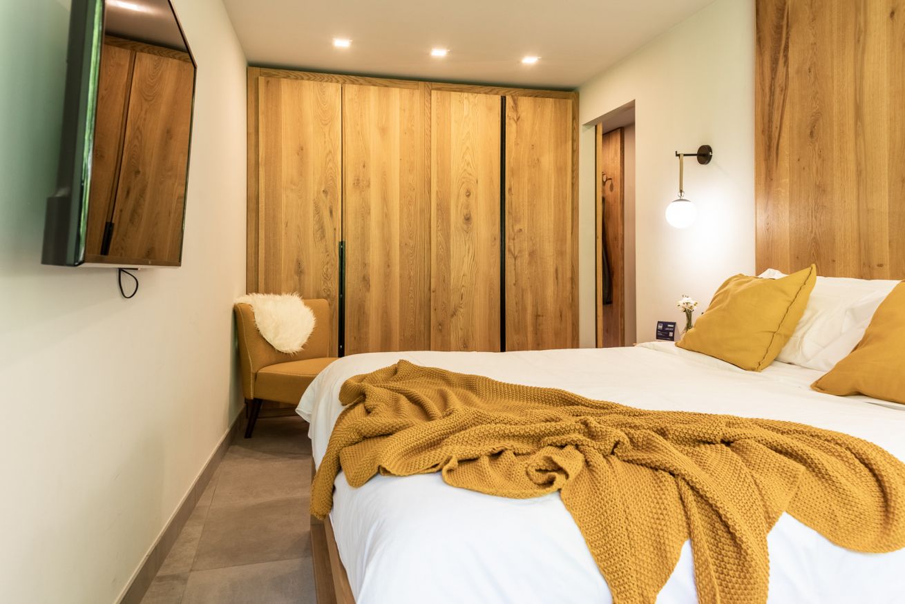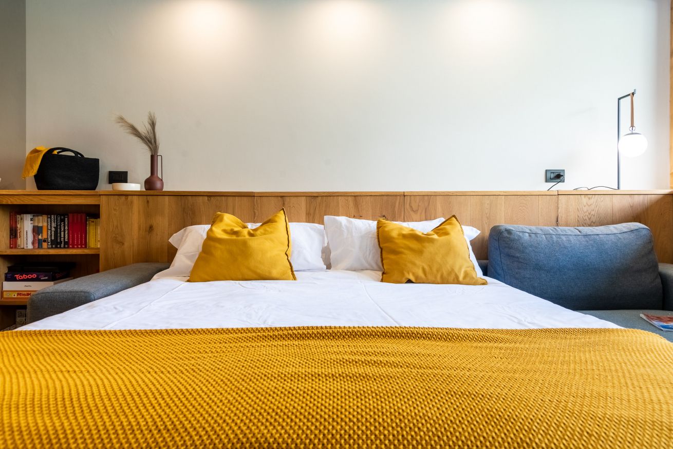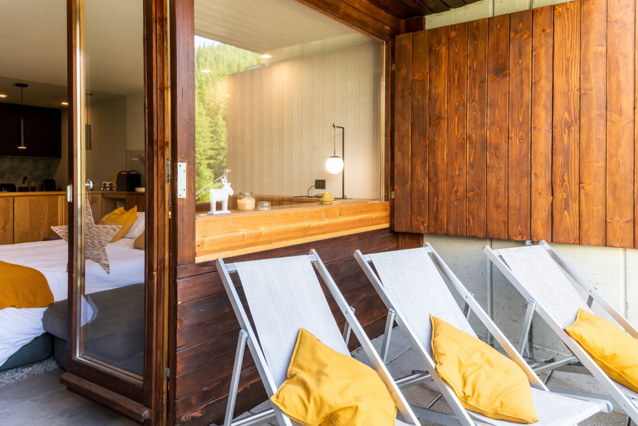 La recente ristrutturazione ha ridisegnato gli spazi in chiave contemporanea, lasciando protagoniste le ampie vetrate e le viste mozzafiato sulle montagne. Che sia inverno o estate, i balconi attrezzati offrono luce naturale e scorci emozionanti, di cui godere per una colazione al sole oppure un brindisi al tramonto dopo una giornata sulla neve.