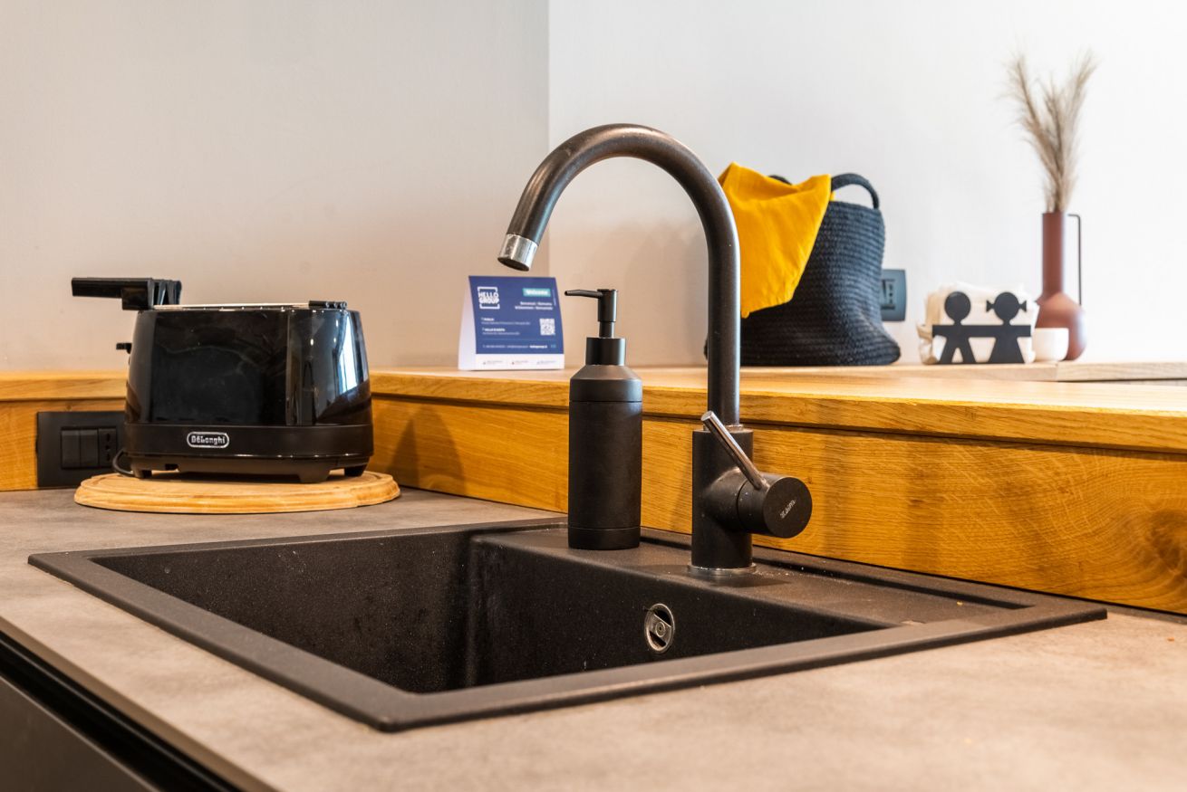• Una cucina attrezzata con forno, lavastoviglie, frigorifero con freezer, macchina Nespresso, bollitore e tostapane