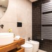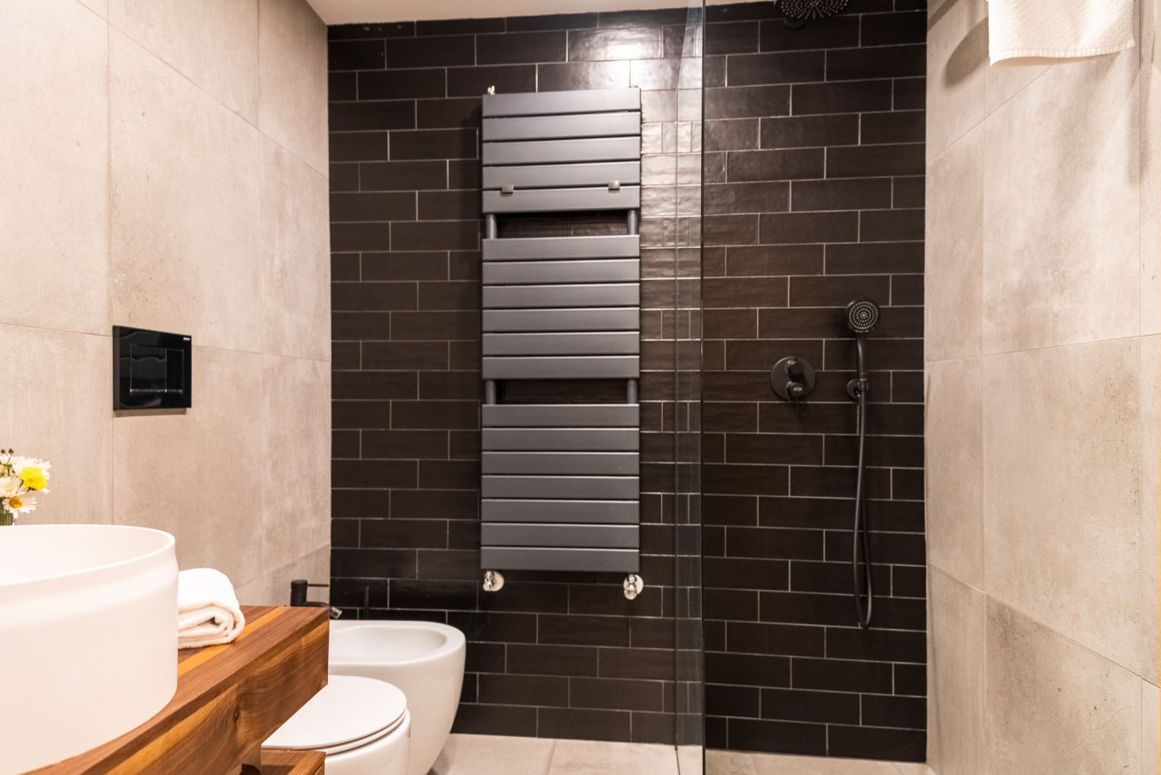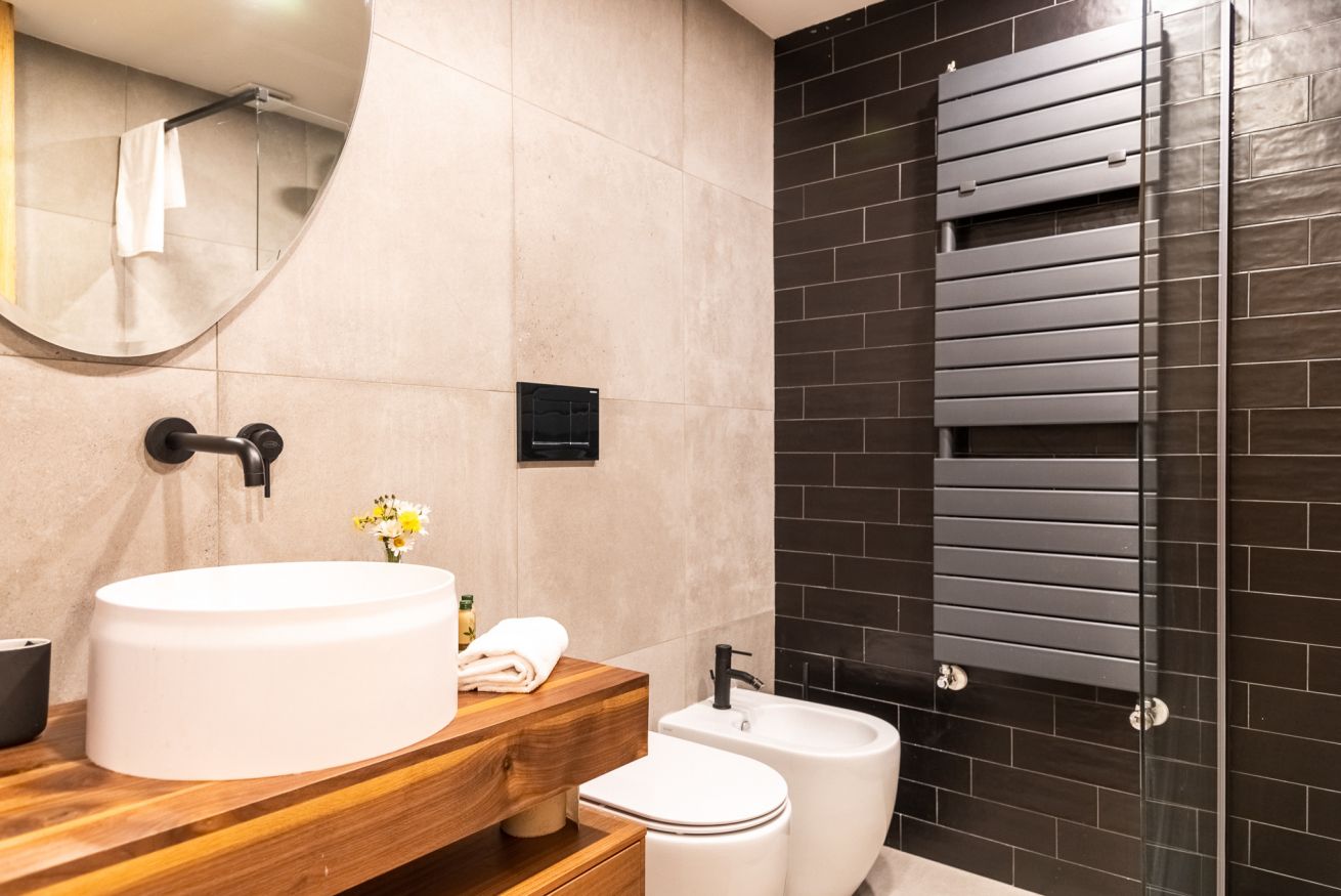 • Un bagno moderno con ampia doccia, bidet e lavatrice