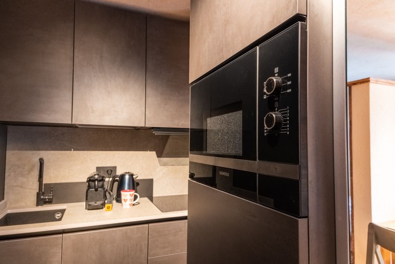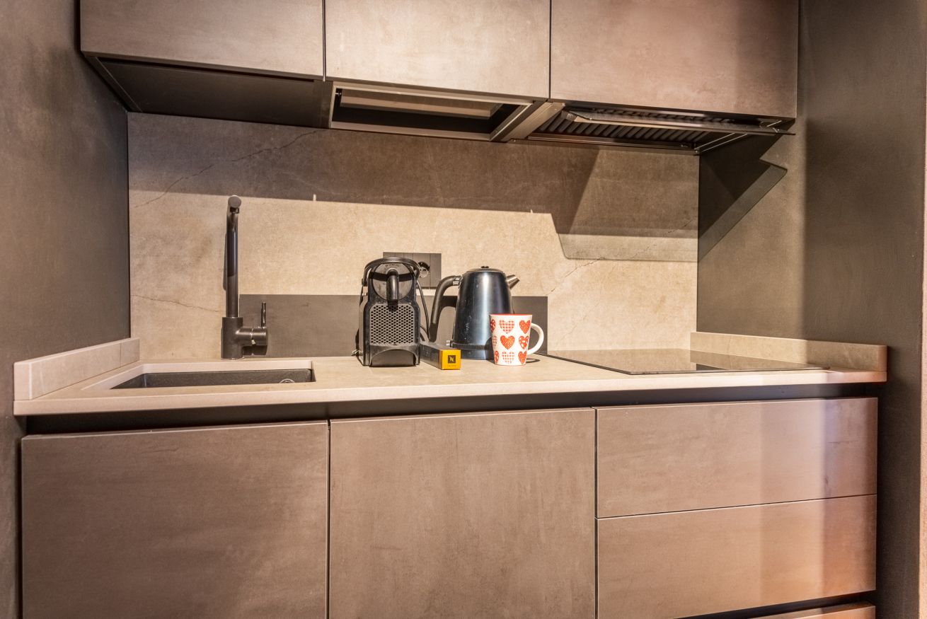 • Angolo cottura attrezzato con piano a induzione, microonde, lavastoviglie, frigorifero, macchina del caffè e bollitore